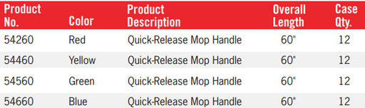 Quick-Release Mop Handles, Available in 4 Different Colors, 60" Fiberglass, Flexible Hinge, Gripper Teeth, 12 Per Case